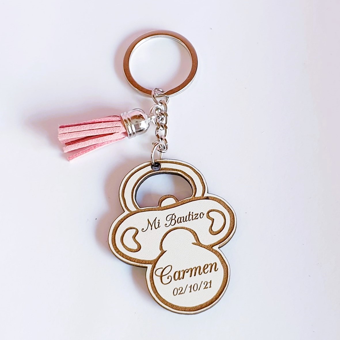 Mas detalles sobre “Llavero madera en forma de chupete” detalle bautizo: