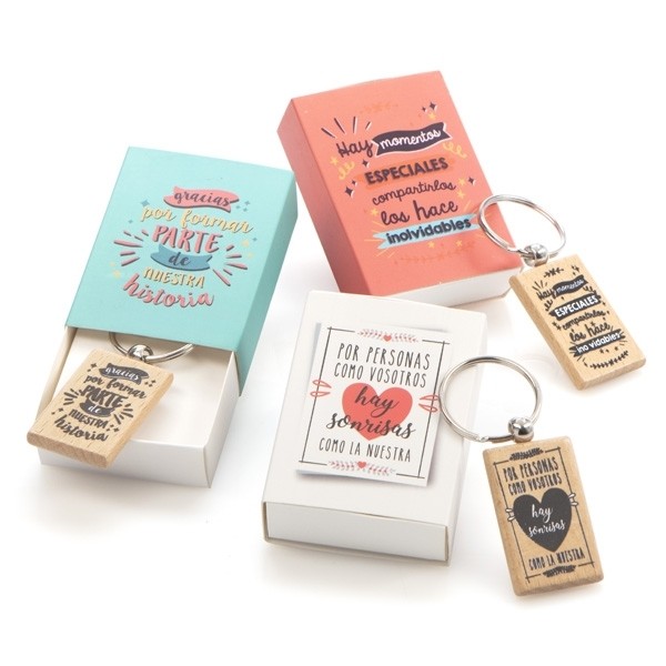 - El detalle perfecto que estabas buscando, compuesto por un llavero de madera para mujer, presentado en una bonita caja regalo con frases para agradecer a tus invitadas que hayan asistido a tu evento. Un regalo original que se sirve surtido de frases y cada llavero va metido en una caja de regalo de colores con unas frases preciosas.