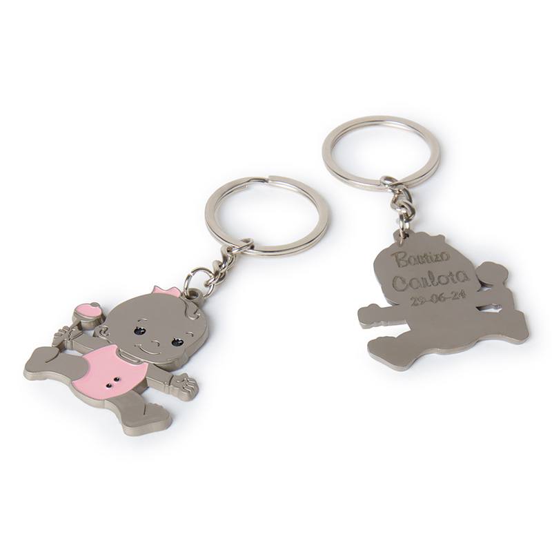 - Un llavero con un diseño moderno ya que es una niña jugando con su sonajero, además va metida en una caja de bambú haciéndolo aún un detalle completo.