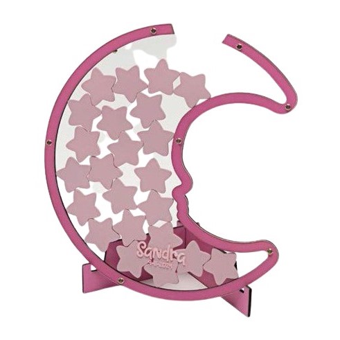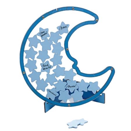 - Este complemento de comunión para niño tiene el diseño de una luna en color azul, donde tus invitados podrán colocar sus mejores deseos escritos en las 25 estrellas que incluye este detalle de comunión, para introducirlas por la parte superior de la luna, formando un bonito diseño con estrellas rosas dentro del metacrilato.