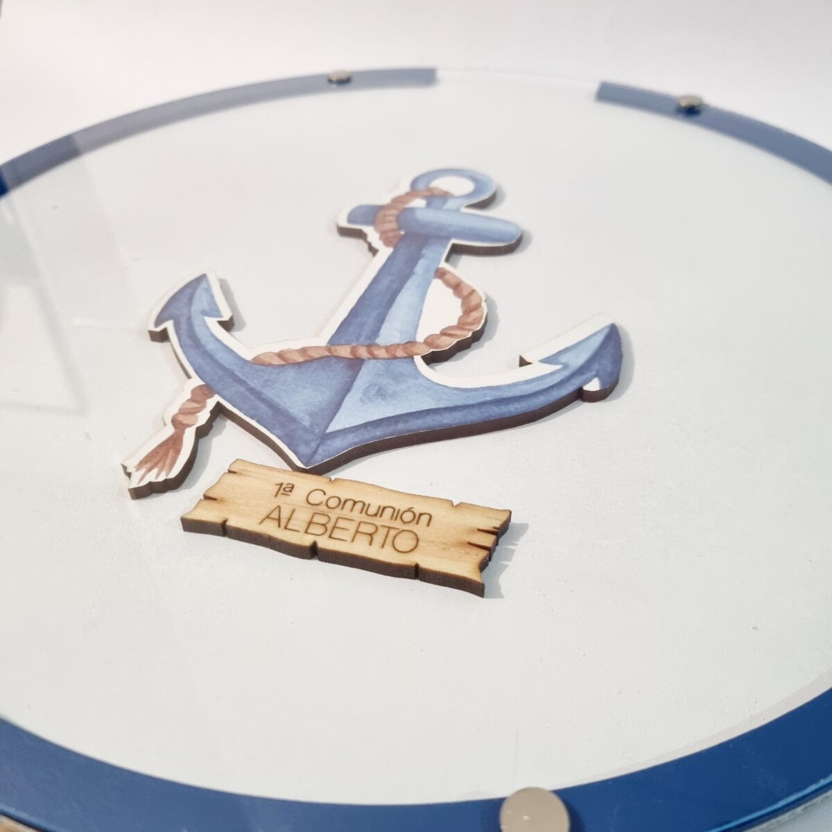 - El marco de firmas modelo ancla, ideal para comunión con temática de marinero, es una original forma para conservar los buenos deseos de los invitados con un buen recuerdo del día más especial para tu peque.