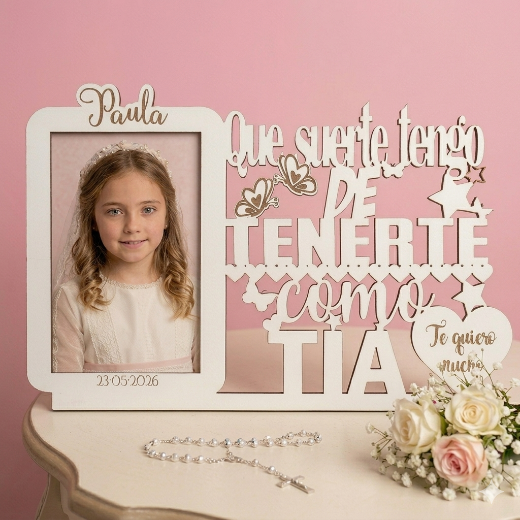 Este marco no es solo un soporte para fotografías; es un recuerdo artesanal diseñado para durar. Con un elegante acabado en blanco que combina con cualquier decoración, el marco incluye la emotiva frase «Qué suerte tengo de tenerte como…», personalizada con el nombre de la niña y la fecha de su comunión.
