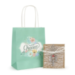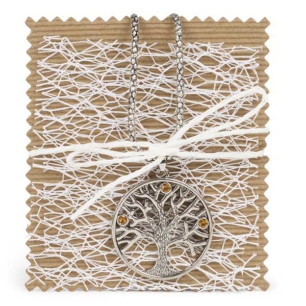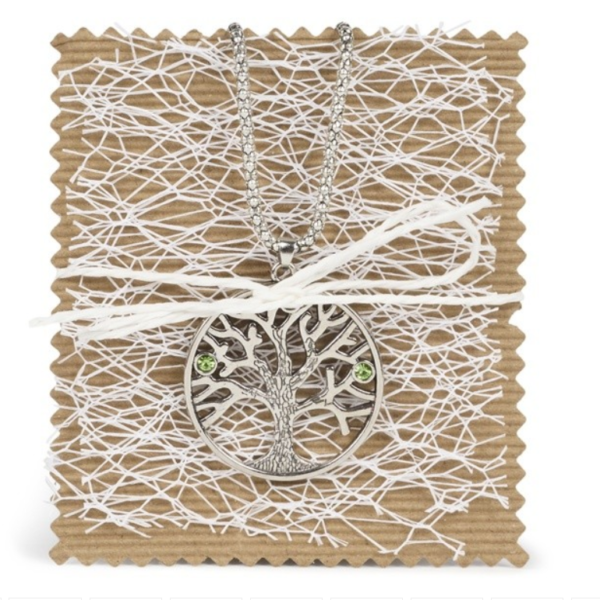 • Viene con cadena plateada, este detalle se presenta en cartón ondulado con una base de rafia y cordón en blanco