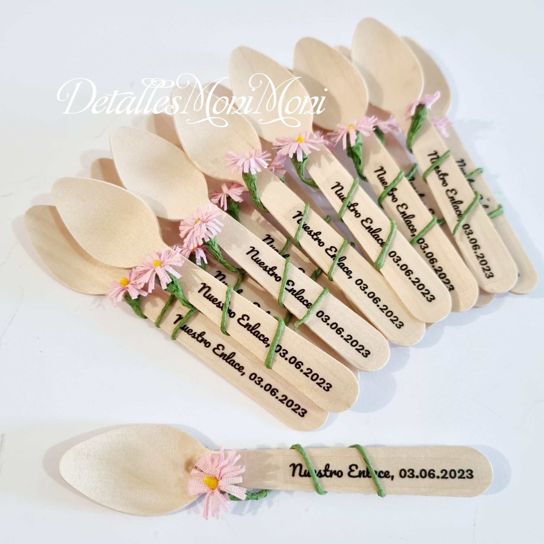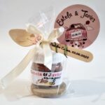 - Con presentación acorde a la celebración… con rodaja de madera, bolsa, lazo, etiqueta, cuchara y flor lista para entregar a tus invitados