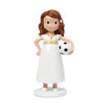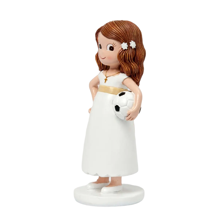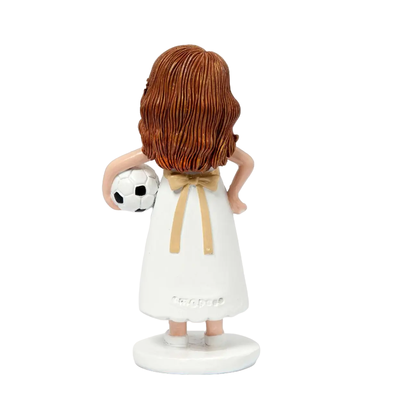 - Se trata de una simpática figura de comunión de niña vestida con un traje largo, pelo decorado con flores y con una pelota de futbol en la mano