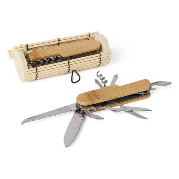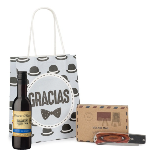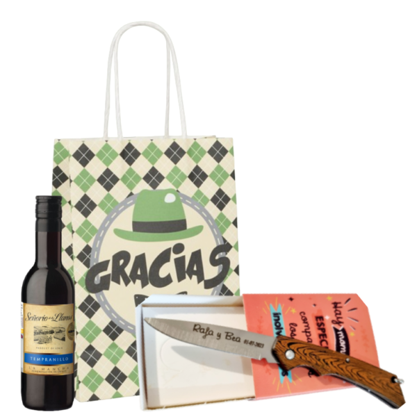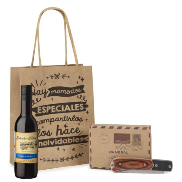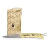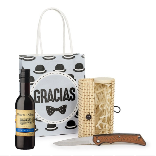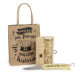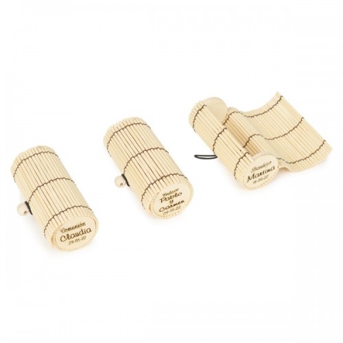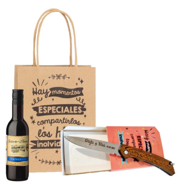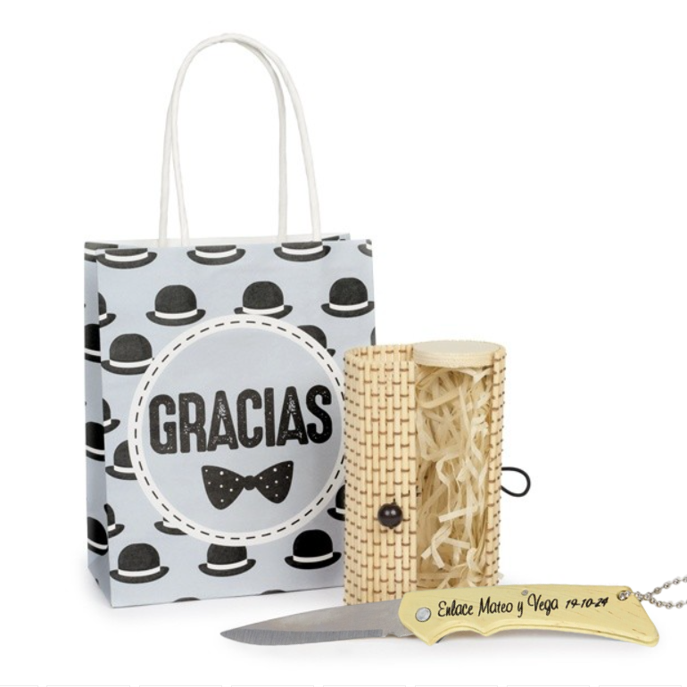 - La navaja personalizada se presenta en un original estuche de bambú combinado con madera, con cierre de bola también en madera. Protegiendo la navaja entre papel de rafia, creando así un bonito conjunto para tus invitados.