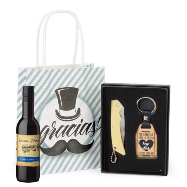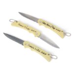 - Dicen que las navajas no se compran, sino que tienen que ser regaladas ya que los cuchillos se han considerado elementos muy poderosos durante siglos ¿Qué mejor que este evento para regalarlas? Diseñada en color plata con la veta de la madera en el mango y un pequeño agujero al final para poder colgar en el llavero con una arandela.