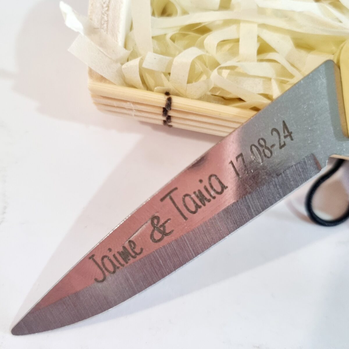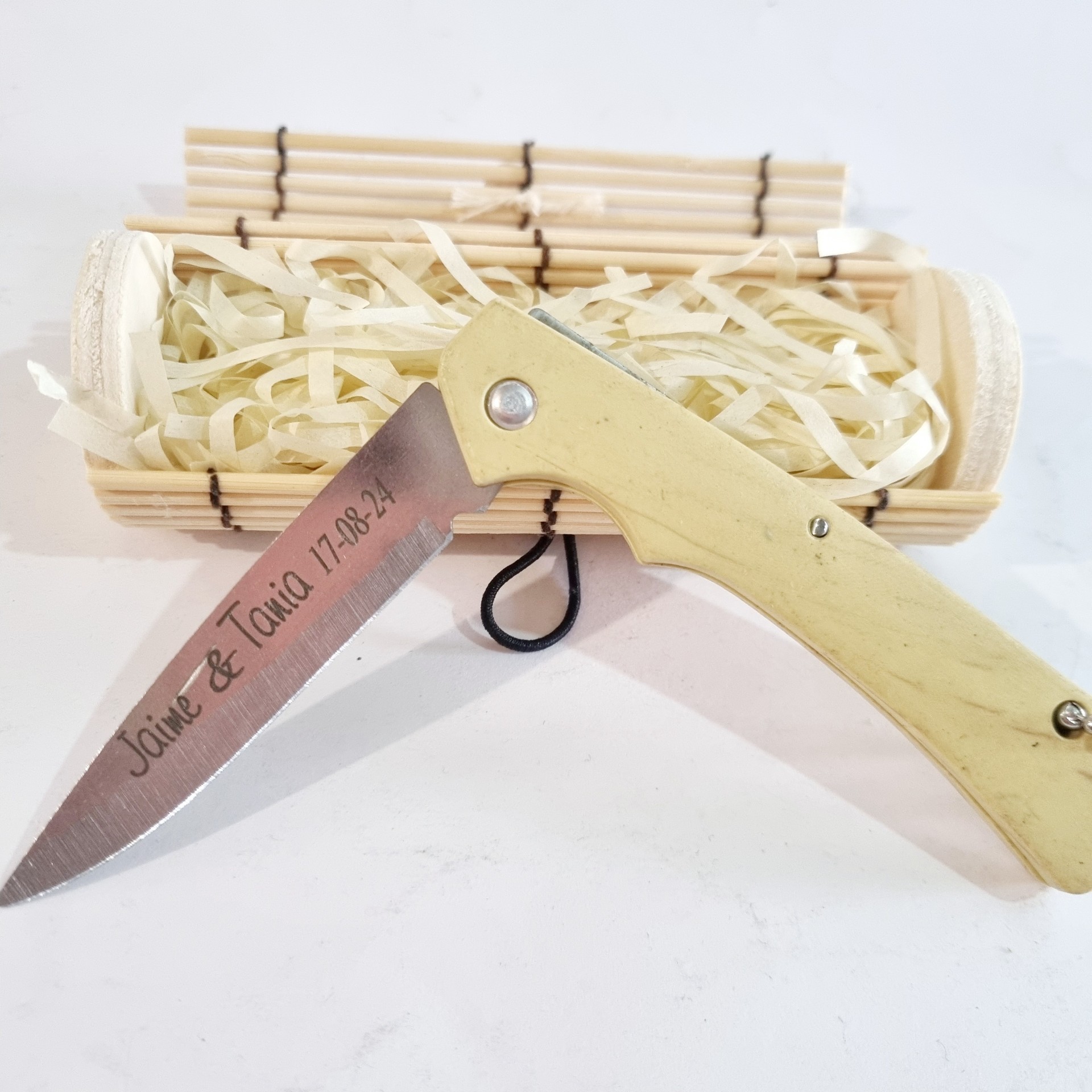 Navaja clara en caja bambú – detalle para boda: