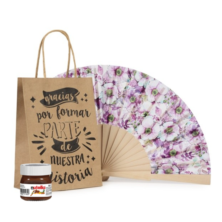 - Combinación perfecta como detalles para invitadas. que incluye una mini Nutella, un abanico de madera modelo floral con opción de personalizar y una bolsa Kraft con frases de agradecimiento o con la palabra “Gracias”