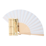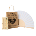 - Pack completo para regalar a las invitadas en la boda, con una combinación perfecta de detalles, que consiste en un práctico bolígrafo en estuche de bambú, acompañado de un coqueto abanico, muy ligero y resistente.