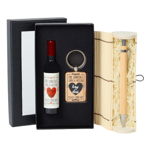 - Acompaña a este set un práctico bolígrafo en madera presentado en estuche de bambú que sorprenderá y será de gran utilidad en el día a día de los invitados. El cuerpo del bolígrafo está hecho con madera natural y detalles cromáticos, que cuenta con el clásico mecanismo de clic con clip y punta de bola. Un bolígrafo ecológico y ejecutivo para tus invitados de boda. Estuche: 15,5 x 4 cm / Bolígrafo 14 cm