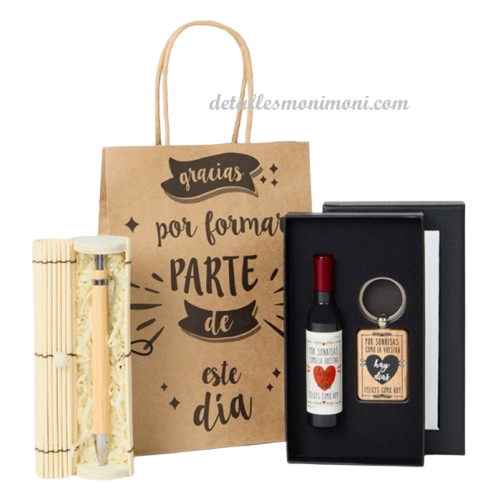 - Pack abridor, llavero y bolígrafo bambú, un pack completo para regalar a los invitados en vuestra boda, con una combinación perfecta de detalles: