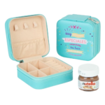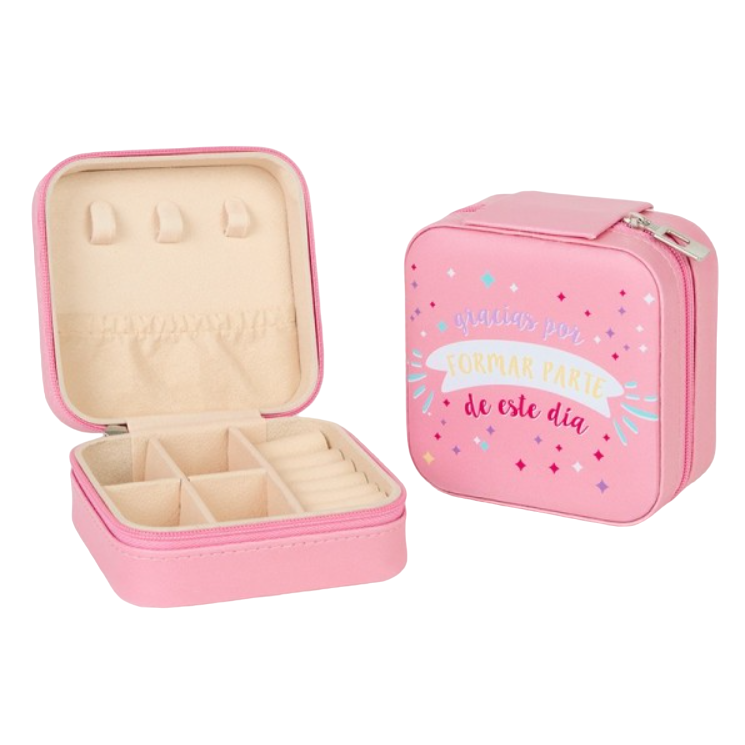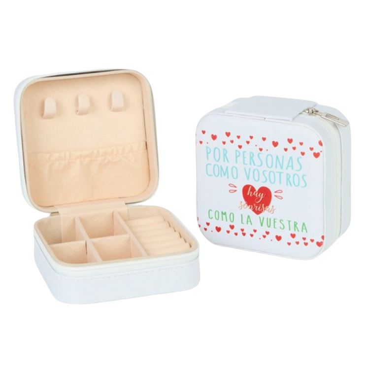 -Por un lado un joyero práctico y alegre con varios compartimentos y variedad de tonos con frases positivas. Este detalle de boda os aseguramos que será todo un éxito y que sacará a más de una invitada una sonrisilla cuando lea una de las divertidas frases con las que cuentan los joyeros. La medida es de 10 cm. alto x 10 cm largo x 5 cm de ancho y se sirve surtido en los tres diseños.
