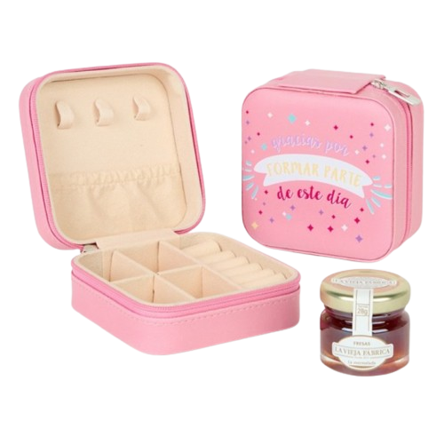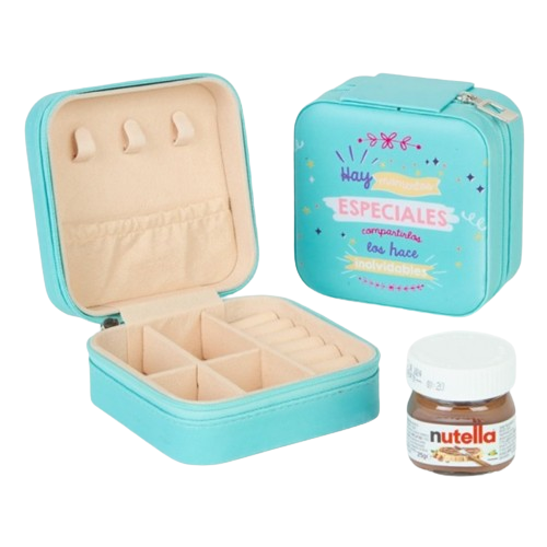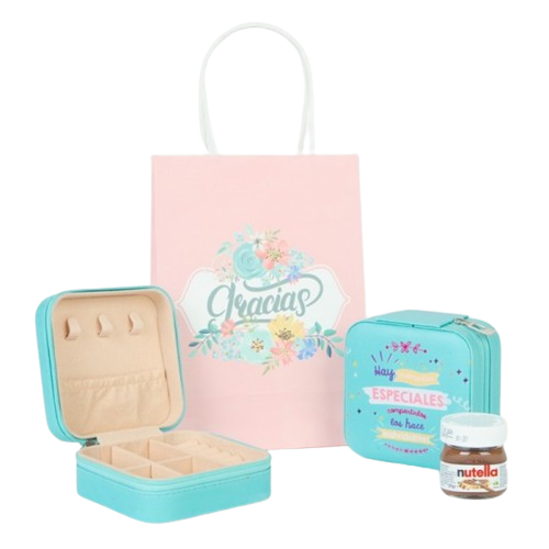 Te presentamos este pack completo, listo para regalar a las invitadas en tu boda. Con él conseguirás regalar la combinación perfecta, que consiste en un original joyero con frases de agradecimiento y una miniatura de Nutella.
