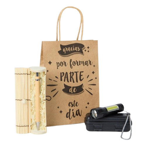 • El pack contiene linterna estuchada y bolígrafo en caja de bambú. Tus invitados al enlace disfrutarán de una maravillosa combinación de detalles, muy pácticos en el dia a día, con acabados de alta calidad.
