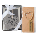 - Pack completo para regalar a los invitados en vuestra boda, con una combinación perfecta de detalles, que consiste en un maravilloso punto de libro en forma de corazón y llavero con frases.
