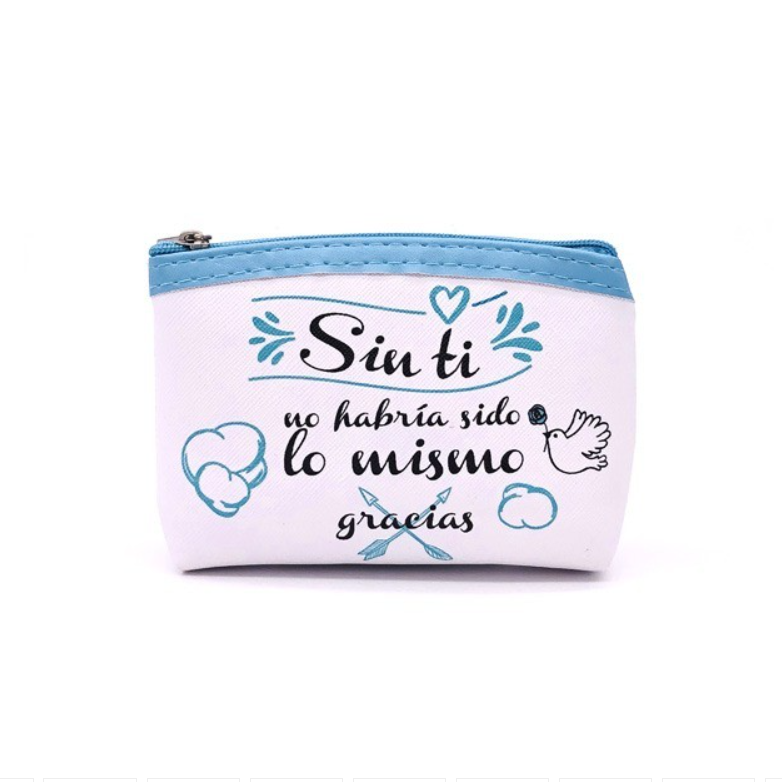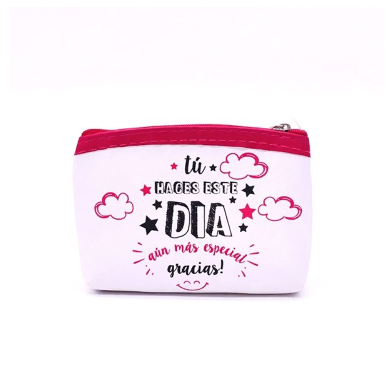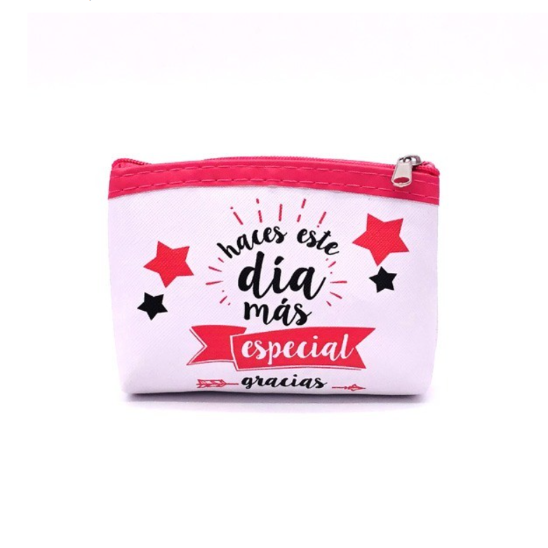 –El monedero modelo gracias con frases se envía surtido en colores y frases. Su medida es de 12 cm x 9 cm.
