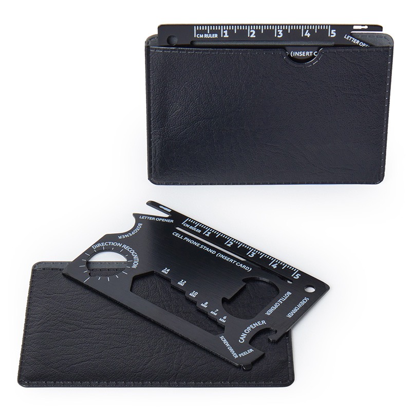 -Por un lado tus invitados tendrán a mano 11 prácticas herramientas integradas en una resistente tarjeta de acero inoxidable, que les facilitará la vida a tus invitados de boda, por un precio muy económico. La herramienta de bolsillo viene con función de abrelatas, destornillador, regla, abrebotellas, llaves inglesas, pelador, abrecartas, soporte para móvil e indicador de dirección, entre otros.