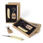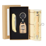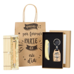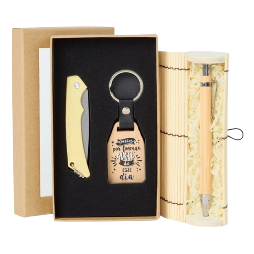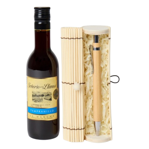 – Bolígrafo en madera presentado en estuche de bambú que sorprenderá y será de gran utilidad en el día a día de los invitados. El cuerpo del bolígrafo está hecho con madera natural y detalles cromáticos, que cuenta con el clásico mecanismo de clic con clip y punta de bola. Un bolígrafo ecológico y ejecutivo para tus invitados de comunión. Estuche: 15,5 x 4 cm / Bolígrafo 14 cm.