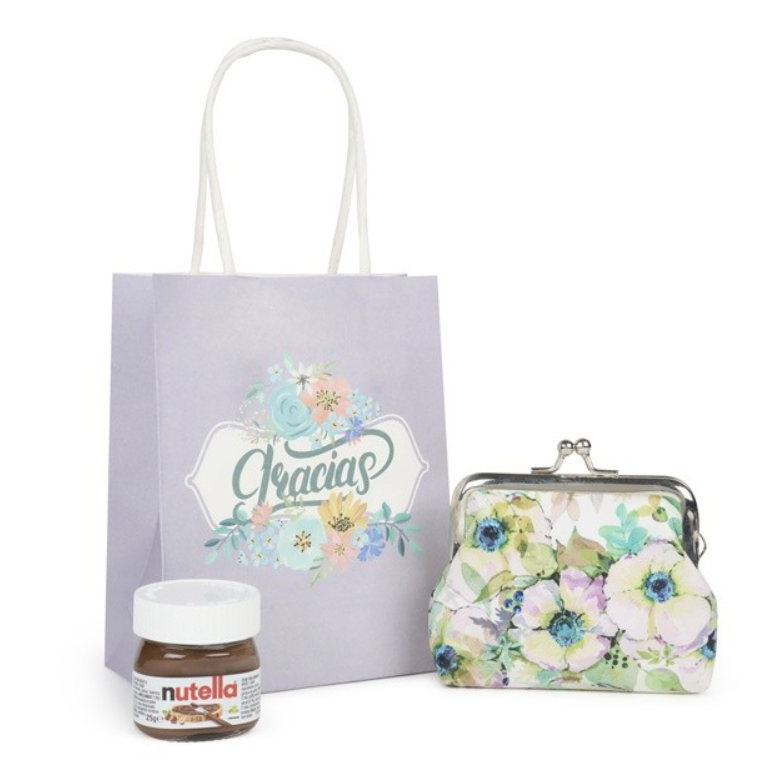- Combinación perfecta como detalles para invitadas, que incluye una mini Nutella, un precioso monedero floral con una bolsa Kraft con la palabra “Gracias”