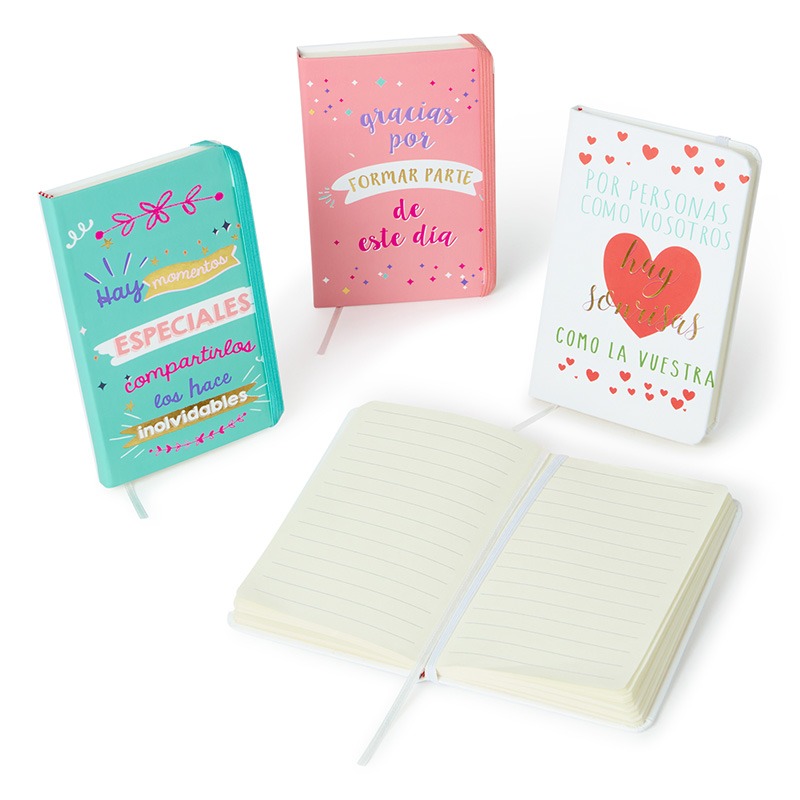 • Una combinación ideal con posible presentación en bolsa de papel Kraft para regalar a tus invitadas de boda. Disfrutarán de una llamativa combinación de detalles con frases de agrdecimiento y colores alegres en set de manicura y libreta a juego.