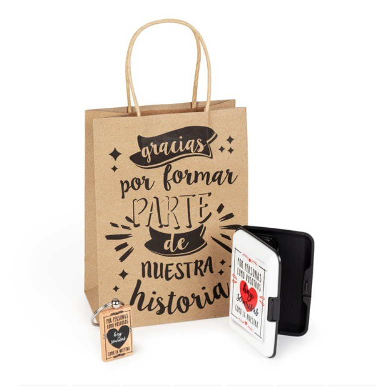 • Consigue que tus invitadas disfruten por partida doble con esta combinación perfecta en bolsa kfrat, que se compone de un tarjetero y un llavero de madera con frases agradables.