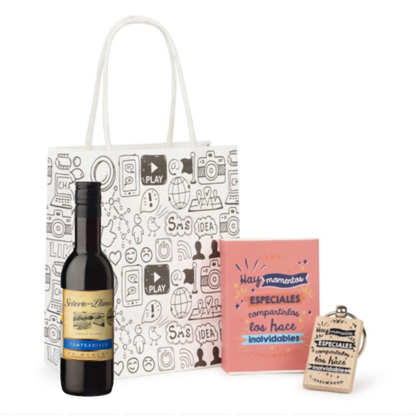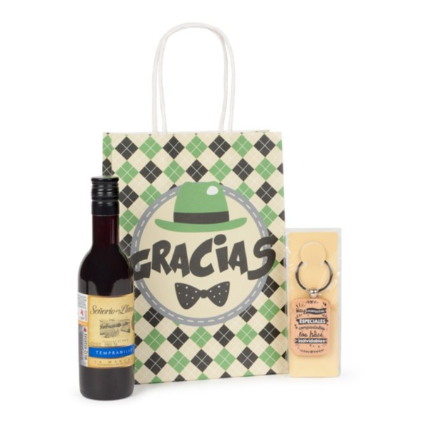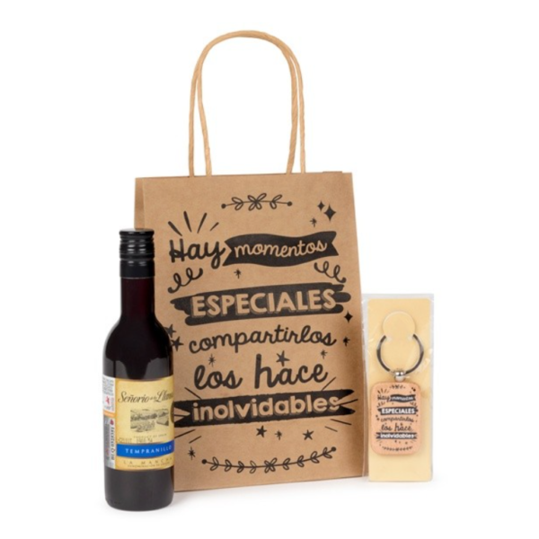 detalle boda hombre Vino con llavero de madera con frases y navaja