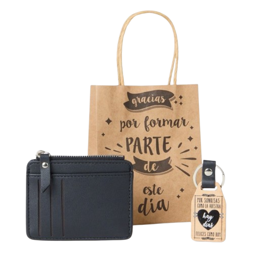• Una combinación ideal con posible presentación en bolsa de papel Kraft para regalar a tus invitados de boda. Disfrutarán de un bonito detalle de boda, muy práctico para salir de casa con todo lo necesario, gracias al tarjetero para llevar documentacion, tarjetas y billetes, más un llavero de madera con detalle y posible personalización con nombre de los novios y fecha del enlace.