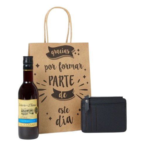 - El más bonito de los detalles de boda para hombres, este pack para que tus invitados disfruten por partida doble con esta combinación perfecta en bolsa regalo de kraft que está compuesto por una botella de vino y una preciosa cartera de hombre.