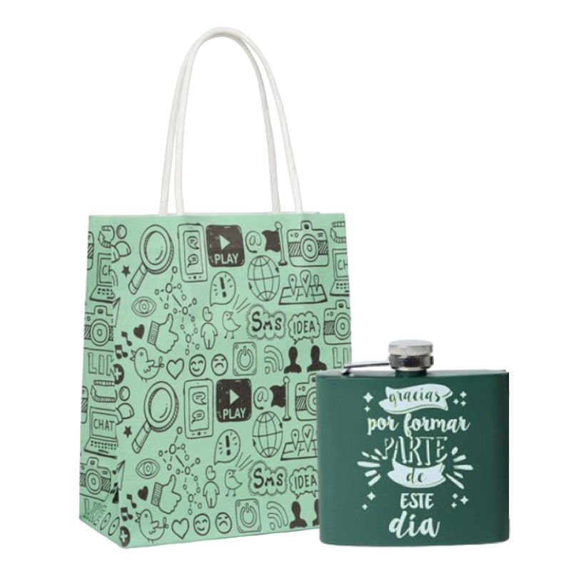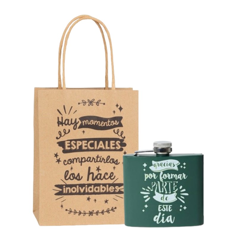 - Detalle de boda para hombre que es una petaca de metal con unas frases perfectas para los invitados y con un diseño actual y moderno, esta petaca es en tono mate y se sirve surtida de colores y frases.