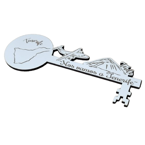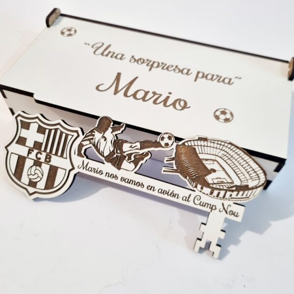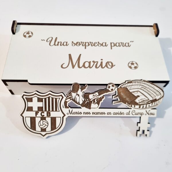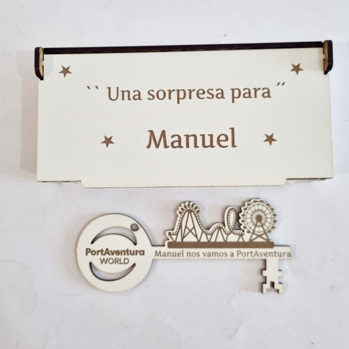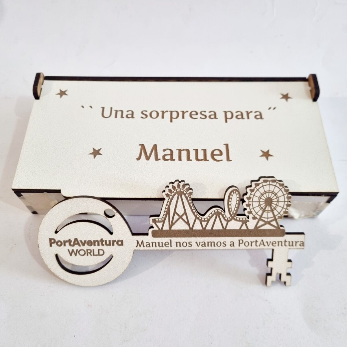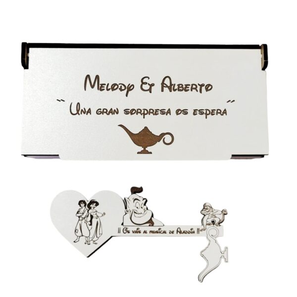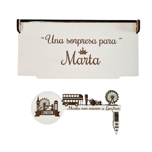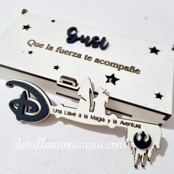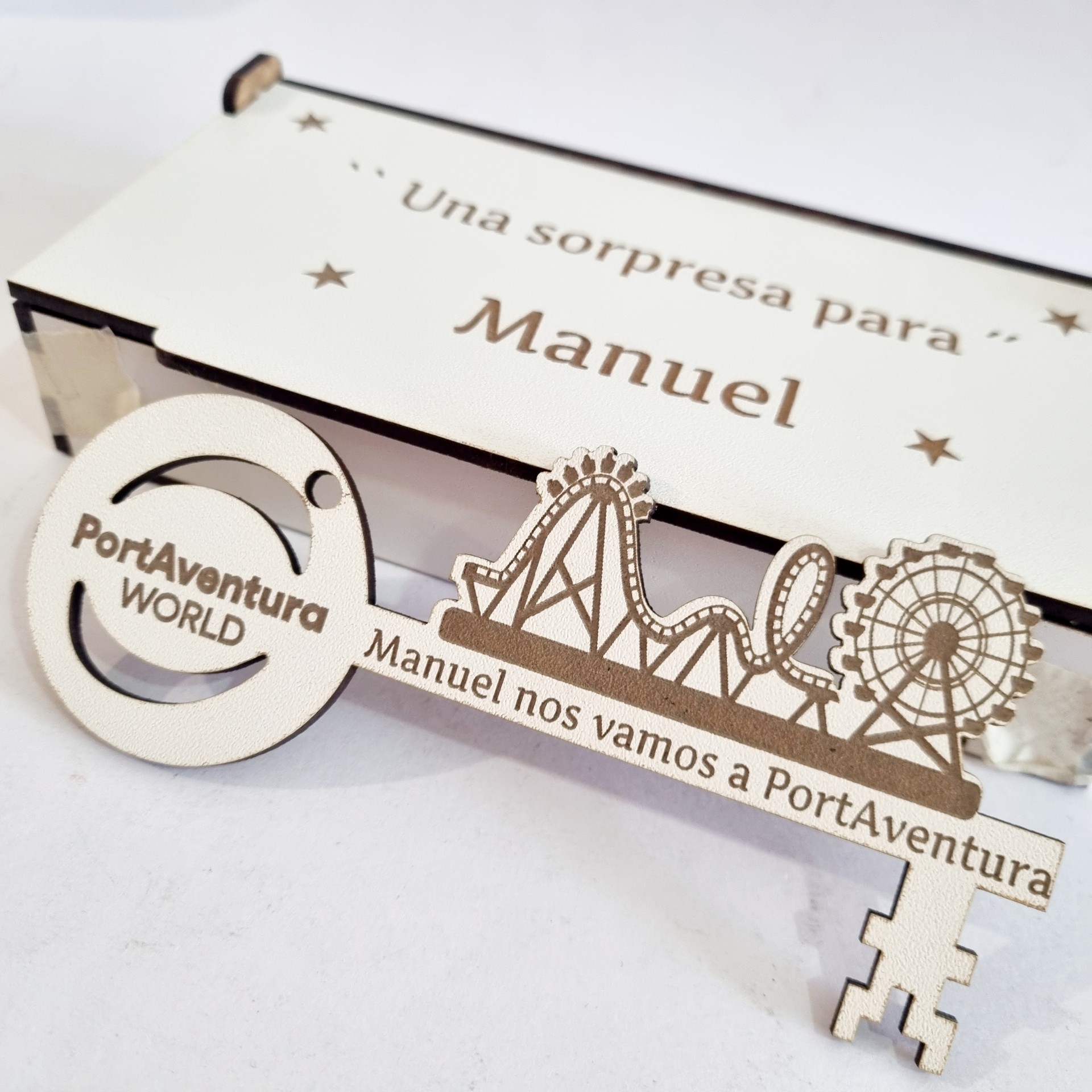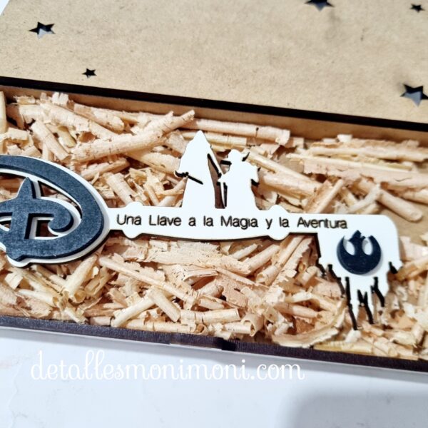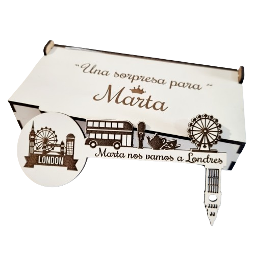 - Con unas medidas de la caja 16 cm x 8 cm aprox. con texto : – “Hay una sorpresa para ……. “ y la medida de la llave mágica 15 cm x 7 cm aprox. con opción de personalizar con grabado a láser