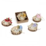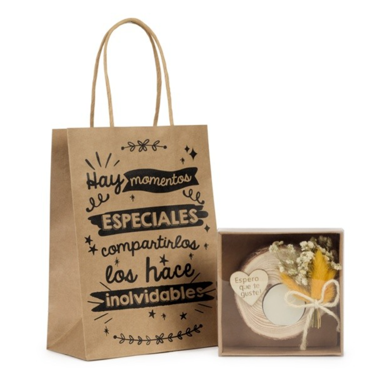 • Con la frase “Espero que te guste” tallado en un pequeño corazón, al que le acompaña la decoración en flor seca con paniculata blanca y espigas en color amarillo, rosa, lila, rojo y azul, sujeto con lazo de color natural.
