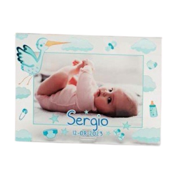 • Portafotos cigüeña bebe azul en matacrilato, con este portafotos le darás la vuelta a todos los recuerdos convencionales de bautizo, sin perder el encanto de los detalles de Bautizo con foto.