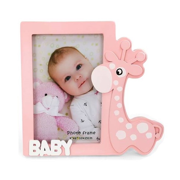 • Portafotos de madera vertical con silueta de jirafa rosa en relieve, para incluir una foto especial de tu pequeño bebé.