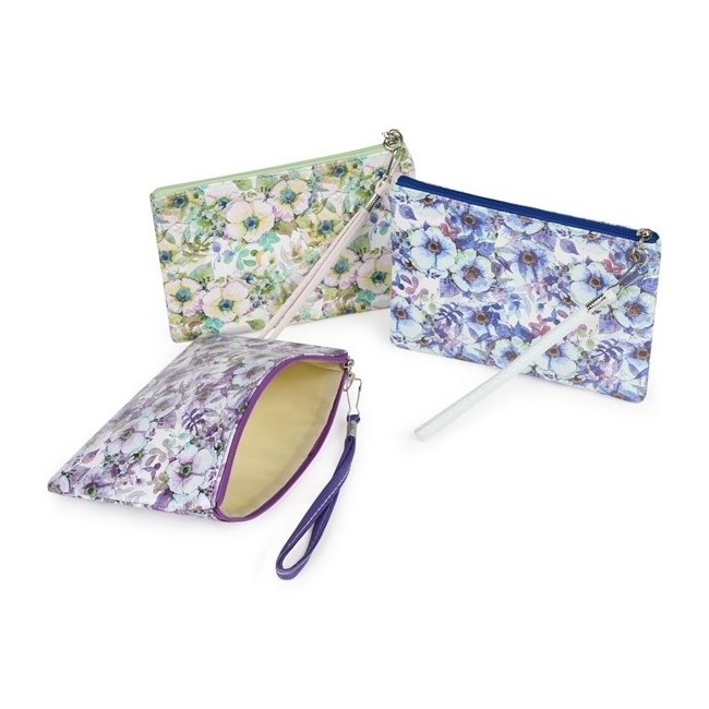 • Sus medidas es de 18 cm x 12 cm., variado en 3 diseños con cremallera y estampados de flores en tonos azules, verdes y morados, que se entregan variados proporcionalmente.