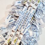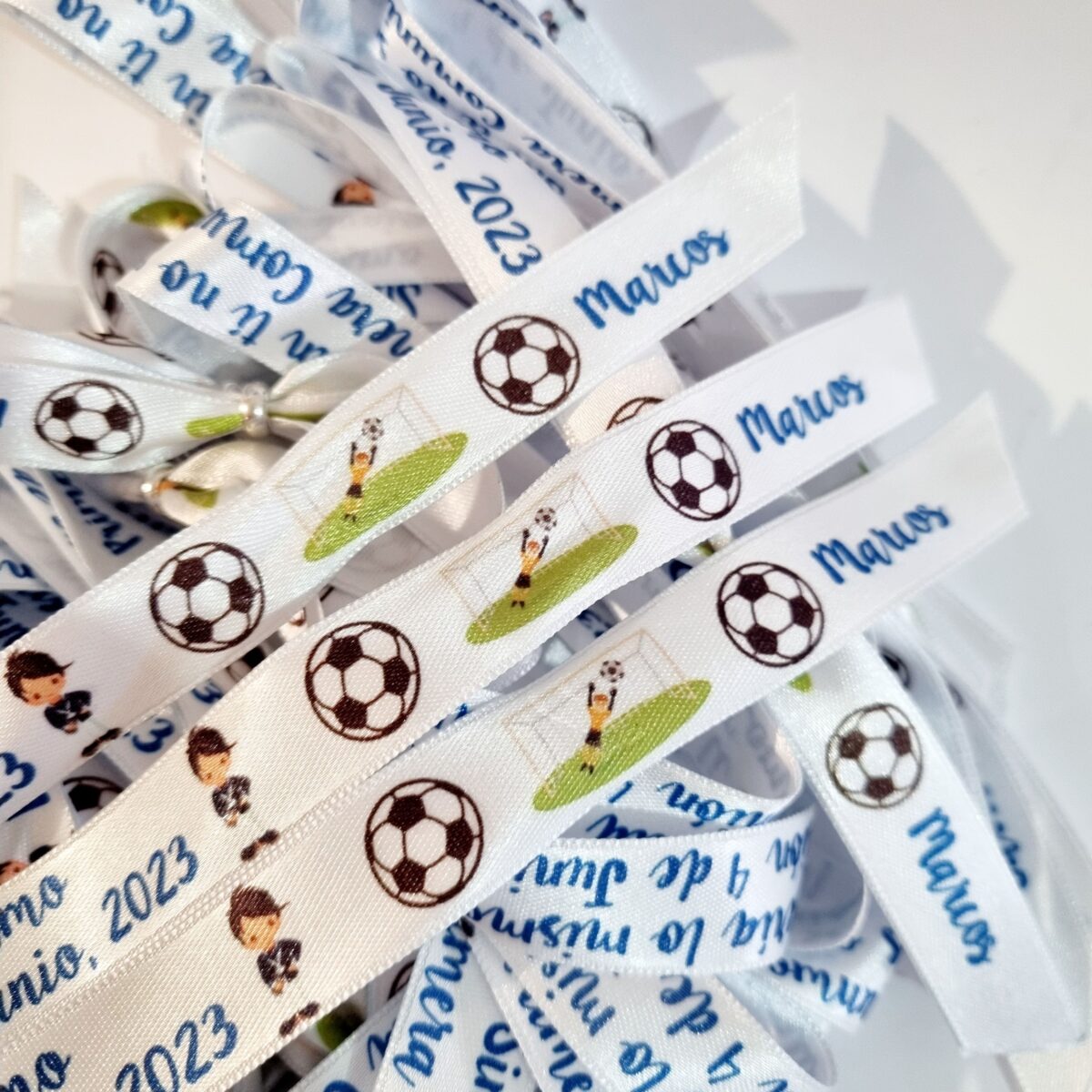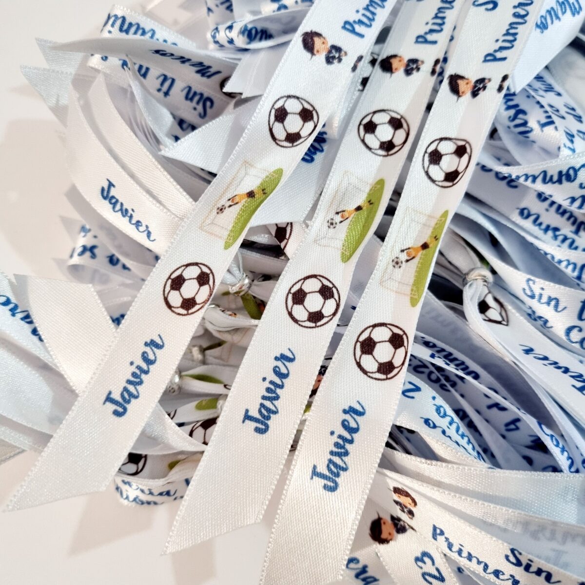 - Pulseras tela o lazo económicas para Comunión con temática de Futbol