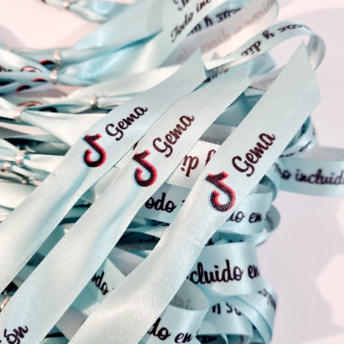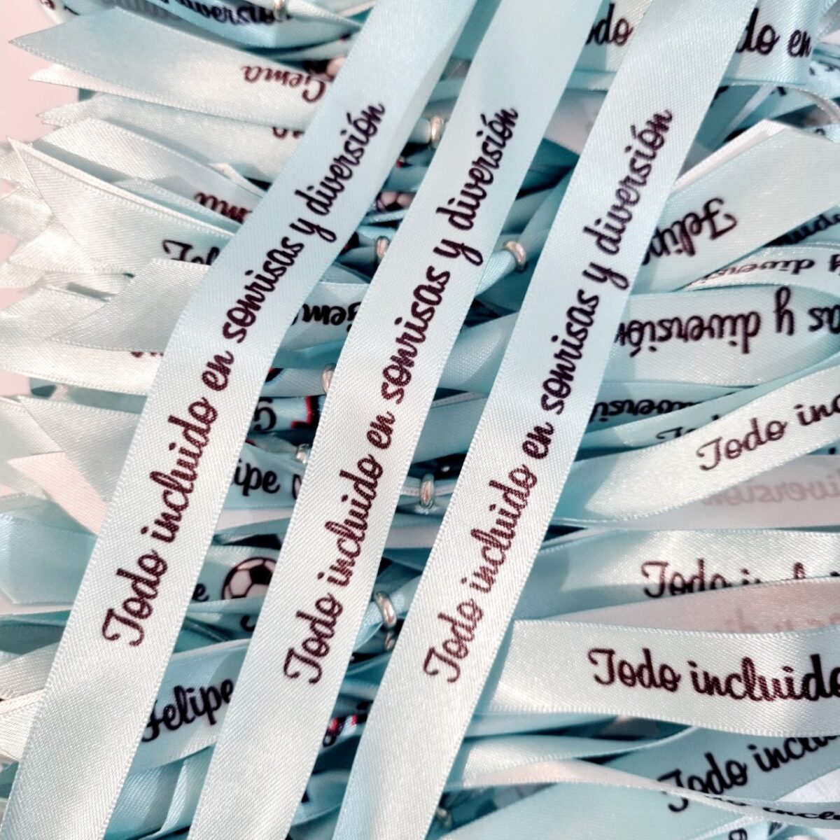 • Pulseras de tela o lazo baratas para Comunión, las pulseras viene con la frase de “Todo incluido en sonrisas y diversión”