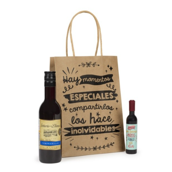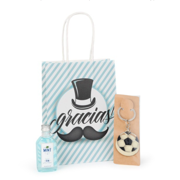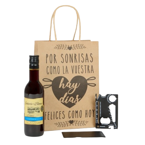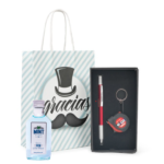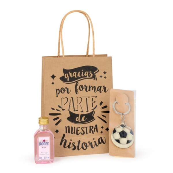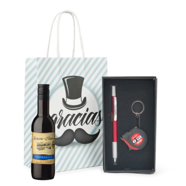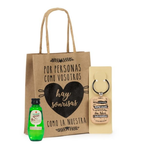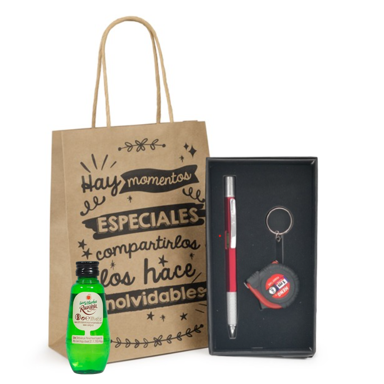 - Aquí te presentamos este pack completo que incluye un bolígrafo con llavero en forma de metro y miniatura de licor, crema, gin o ron a elegir, todo ello envuelto en una bolsa regalo de Kraft.