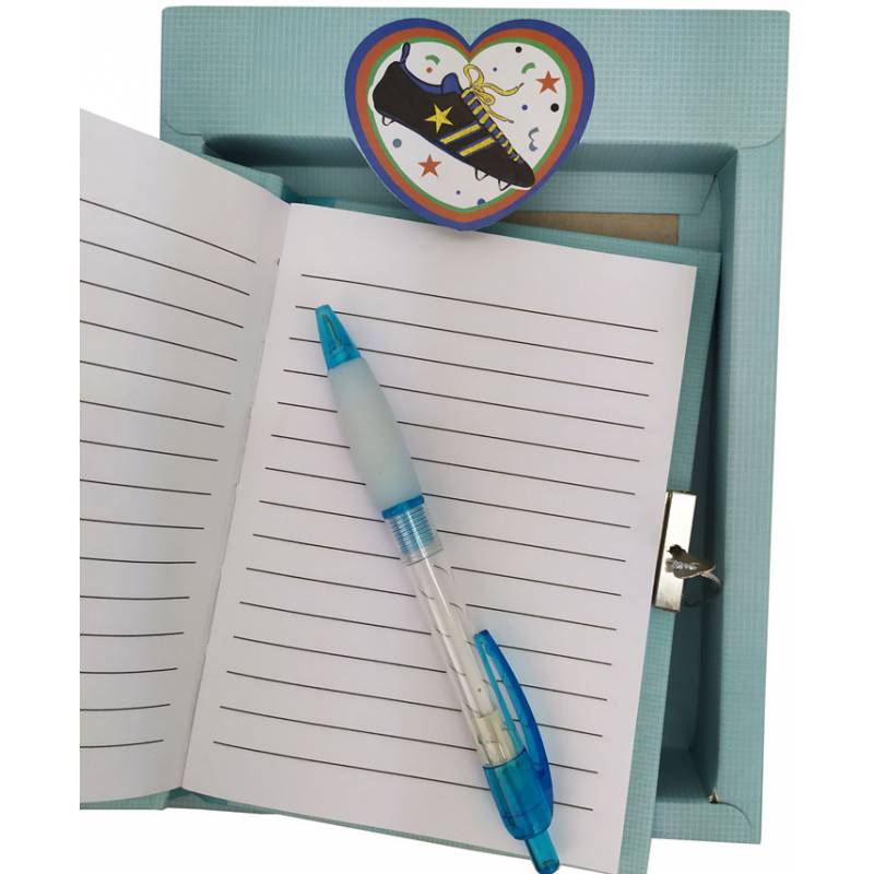 Juvenil set compuesto por diario y bolígrafo presentado en caja de regalo con divertido diseño de fútbol. (El bolígrafo es el de la segunda foto)