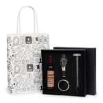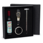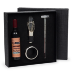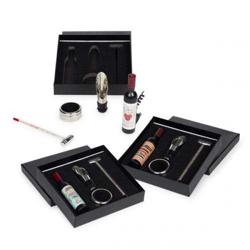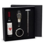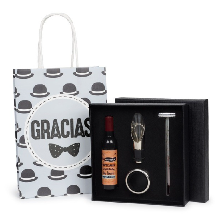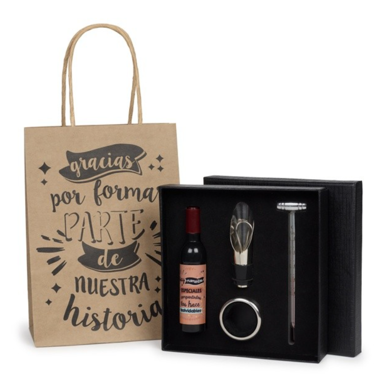 - Un estuche con 4 accesorios imprescindibles para el vino con el que tus invitados contarán con un tapón decantador, anilla antigoteo, termómetro para mantener la temperatura óptima del vino y un original sacacorchos en forma de botella, etiquetadas con las siguientes frases de agradecimiento: