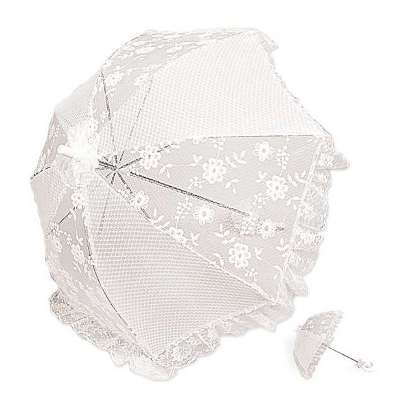 Sombrilla de encaje y calado blanca, esta sombrilla para novias hará que destaques como la novia mas original y moderna, sorprendiendo a todos tus invitados, sin duda sera el complemento perfecto para el día de tu boda.