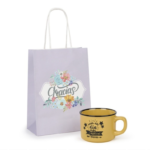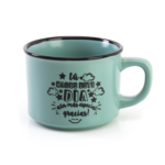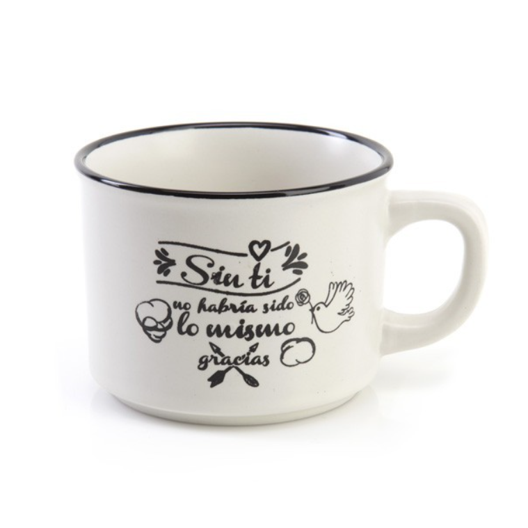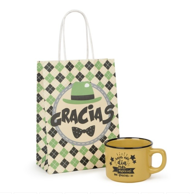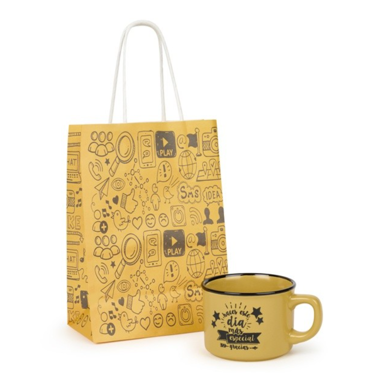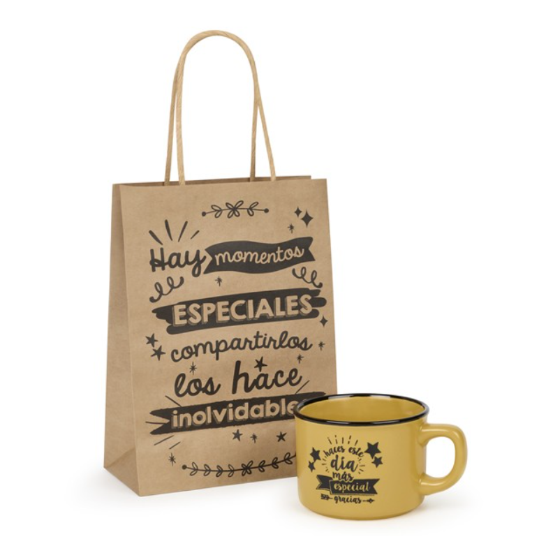 • Es una taza de cerámica presentada en una pequeña cajita de cartón kraft con ventana