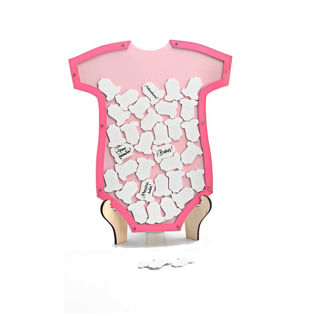 • Contenido: Trarjecito grande con soporte más 40 mini trajes, donde los invitados dejarán sus deseos en el bautizo de la niña..