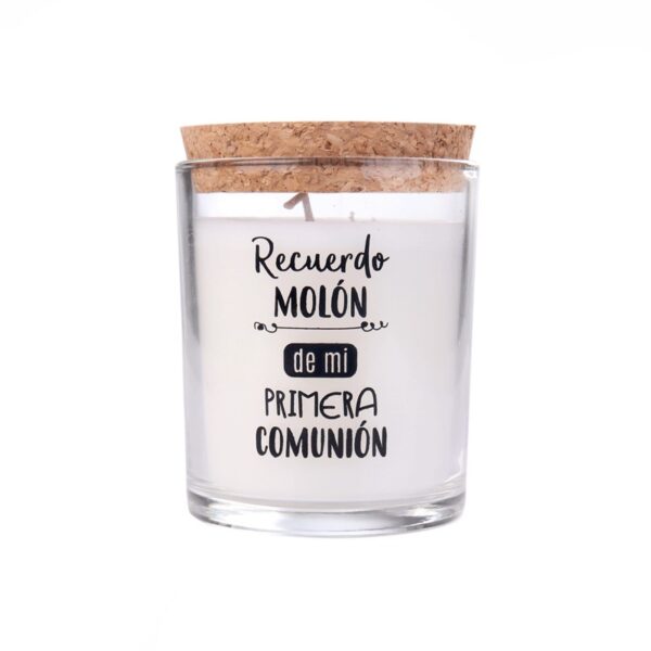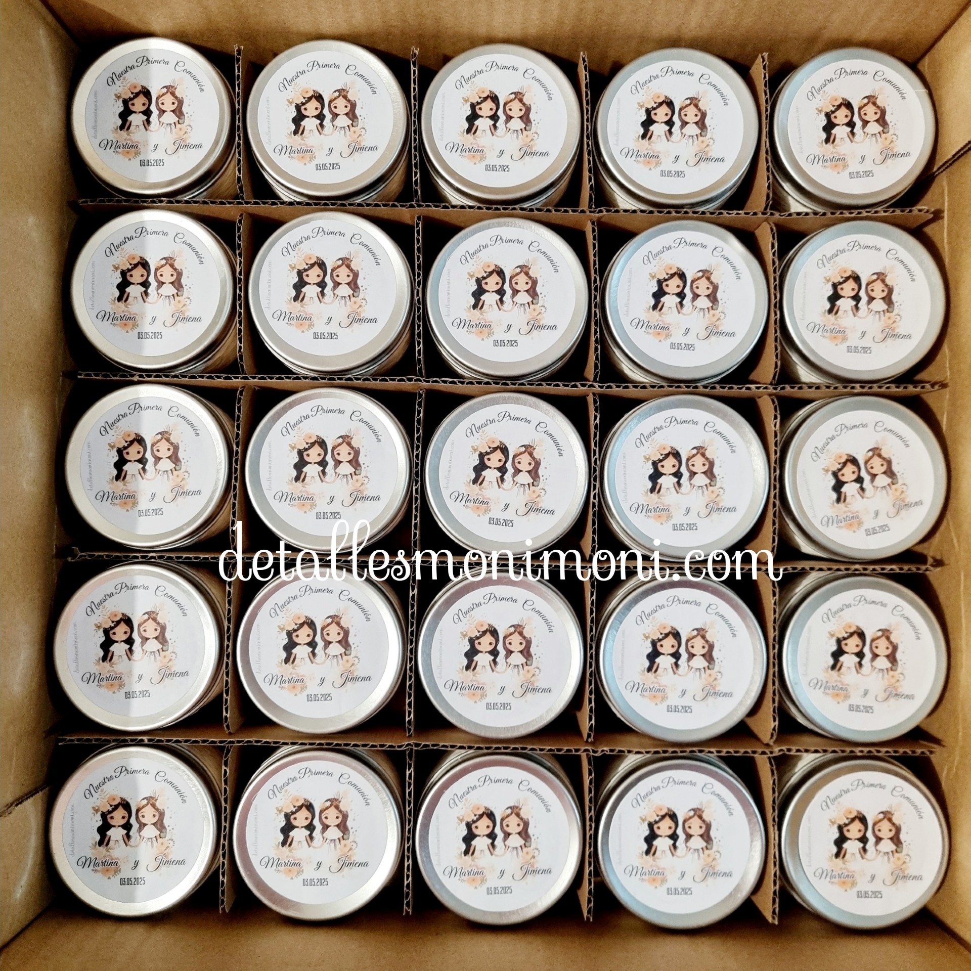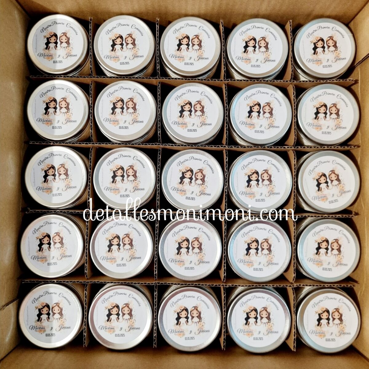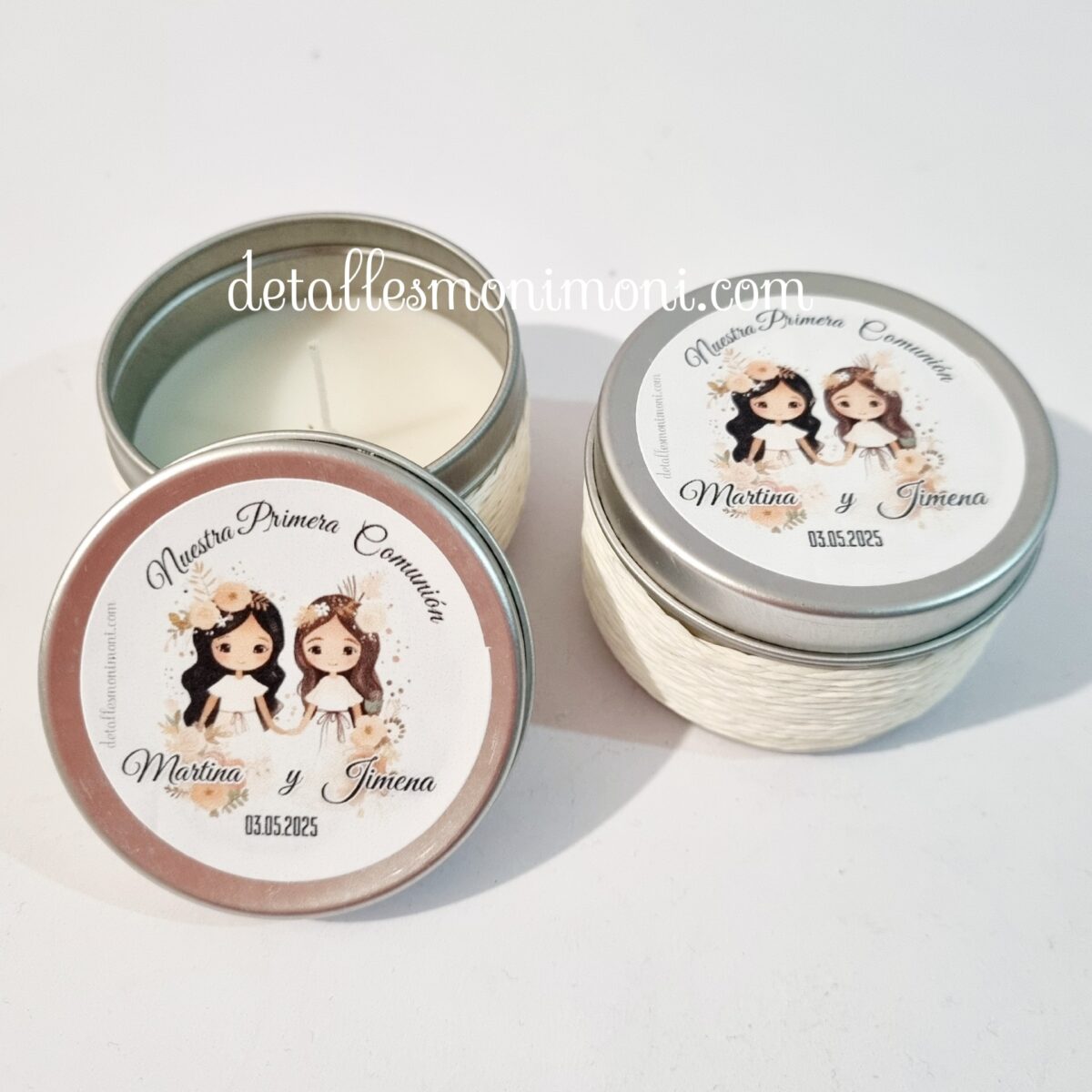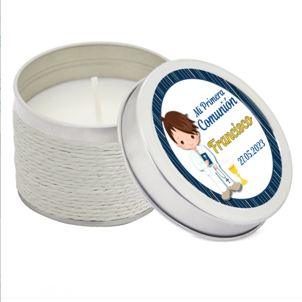 - La vela personalizada para Comunión de niña, cuenta con un original diseño en bote de latón con tapa y cuerda de ratán alrededor de color en combinación con la vela.