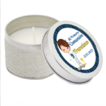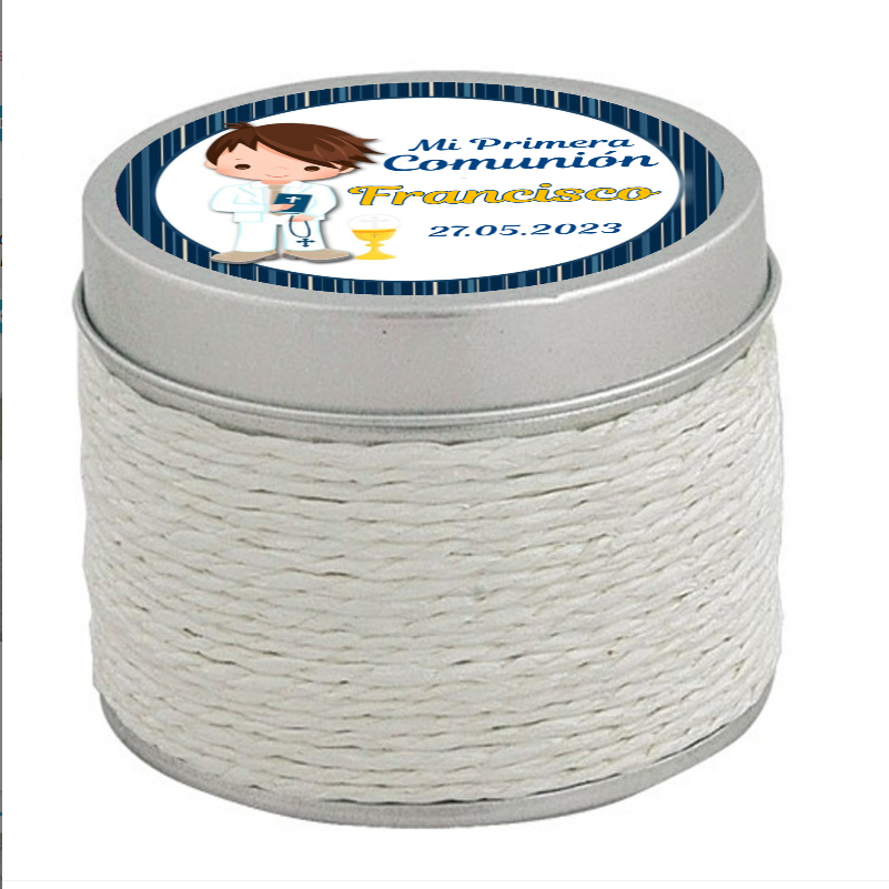• La vela personalizada para Comunión de niño, cuenta con un original diseño en bote de latón con tapa y cuerda de ratán alrededor de color en combinación con la vela.